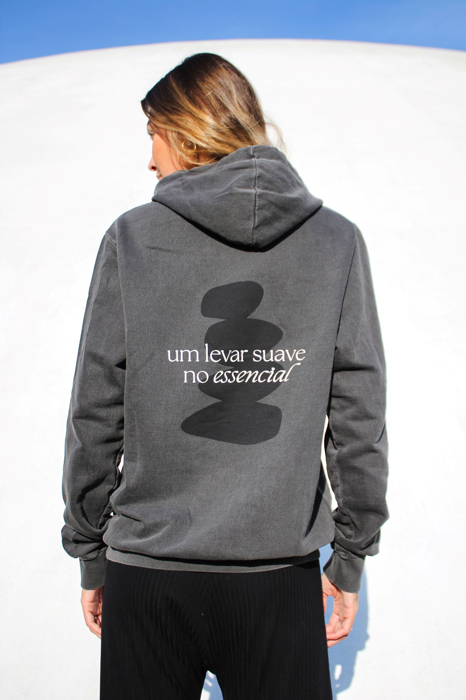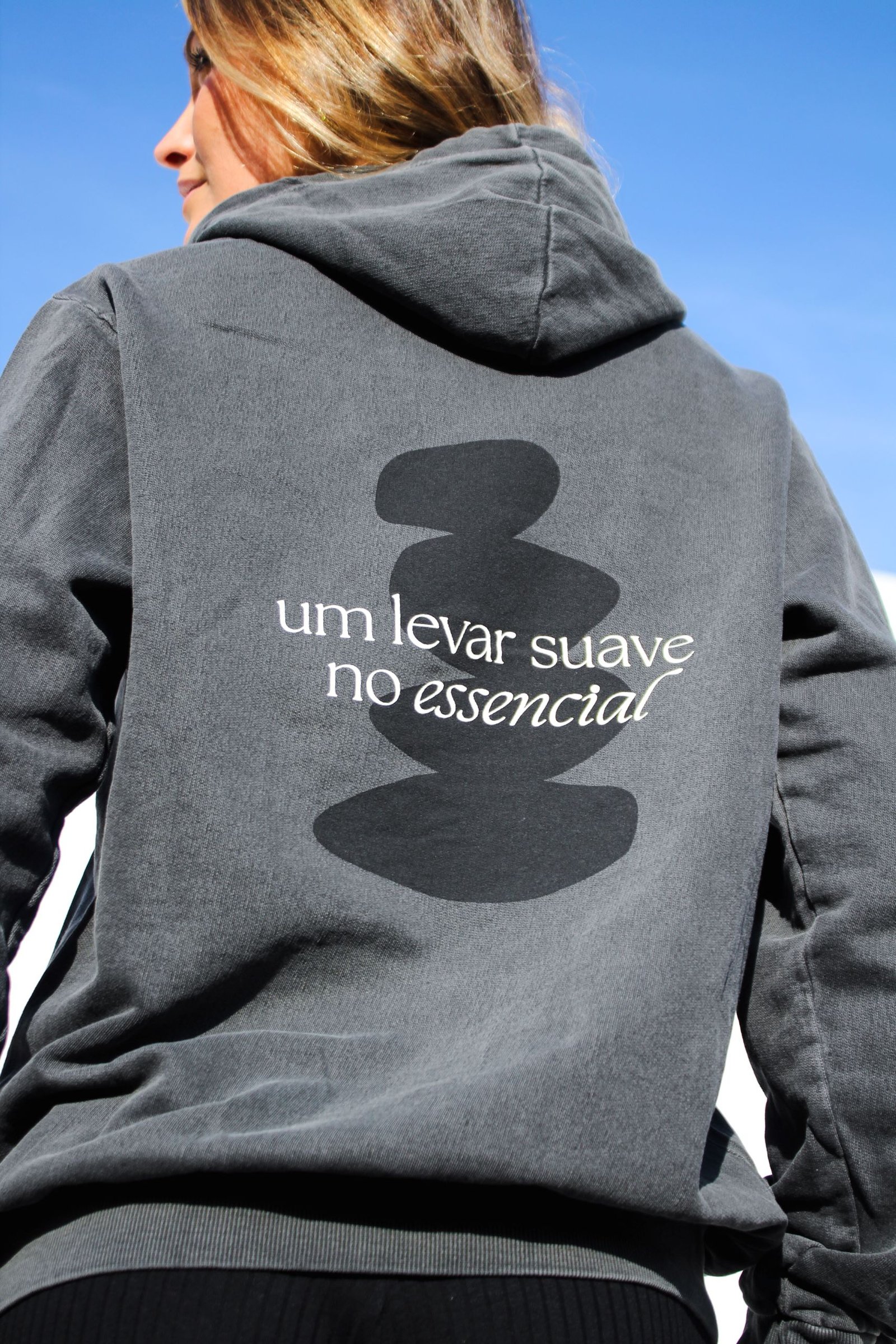 Com capuz ajustável e bolso canguru, oferece praticidade e proteção nos dias mais frios. O destaque fica para a estampa nas costas: um totem exclusivo acompanhado da frase “Um levar suave no essencial”, que traduz a essência de viver com leveza e propósito.
