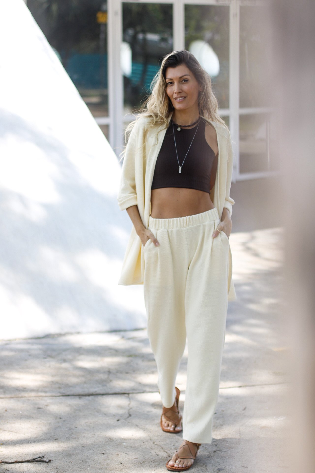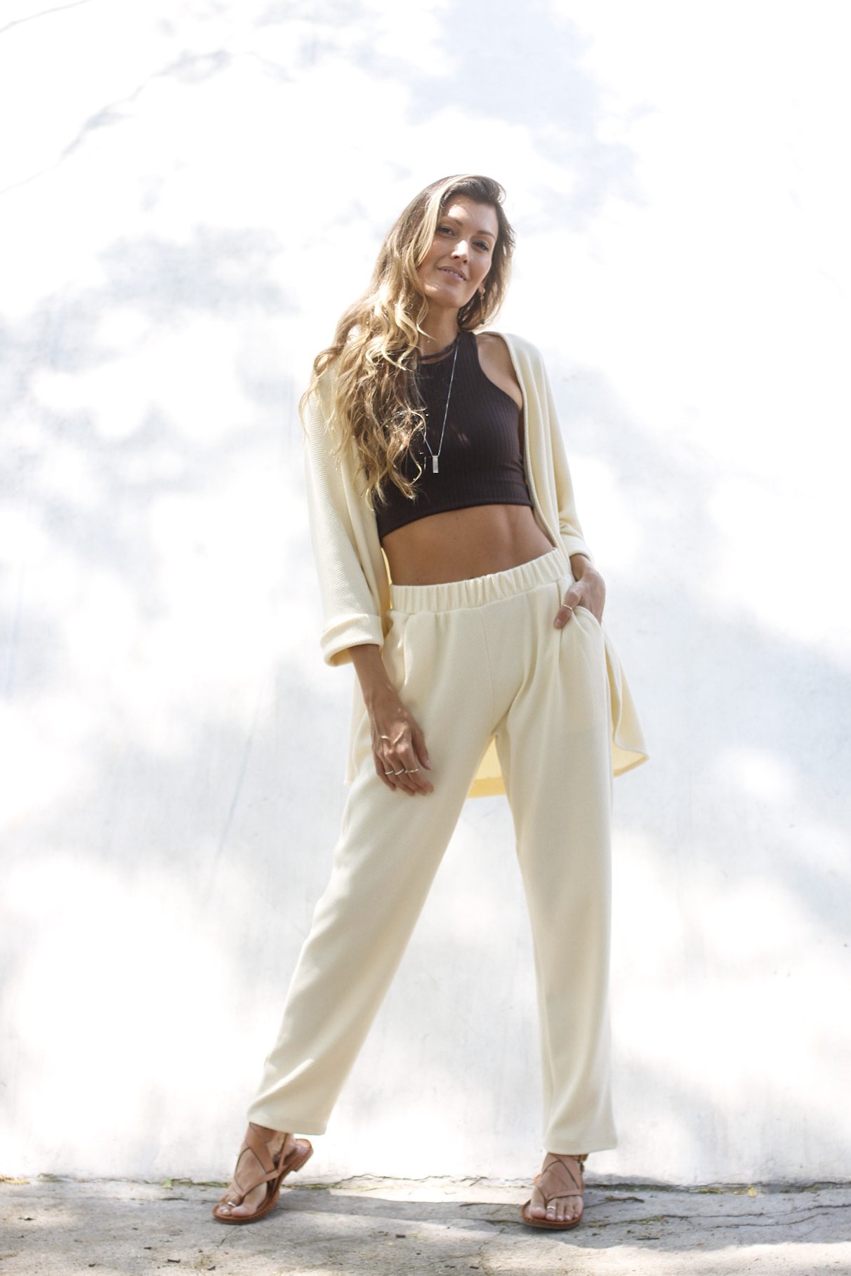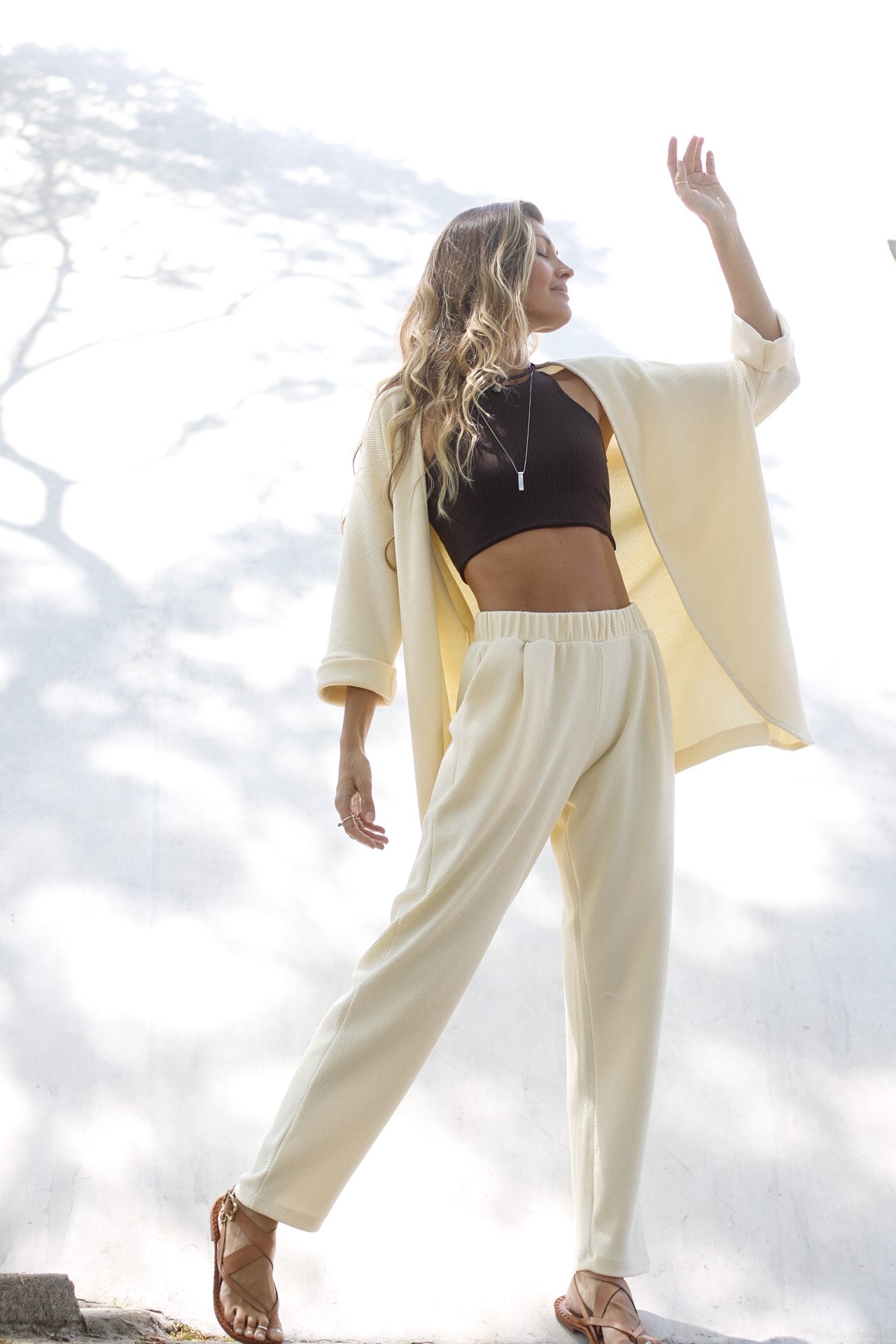 Confeccionado no mesmo tecido da Calça Travessia, possui textura delicada e visual orgânico, que adiciona profundidade à peça sem excessos. O toque é macio e confortável, ideal para vestir com suavidade depois do movimento.