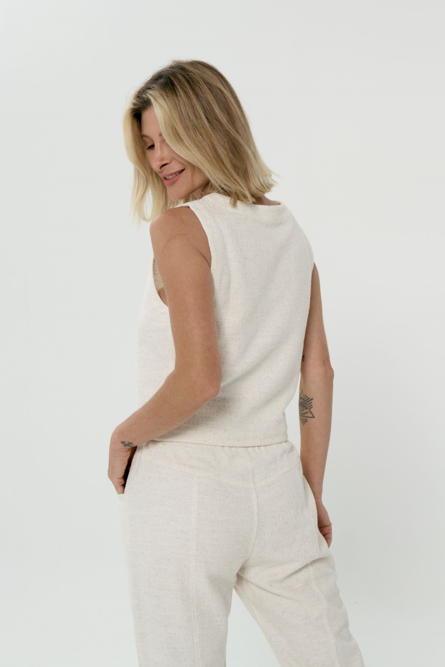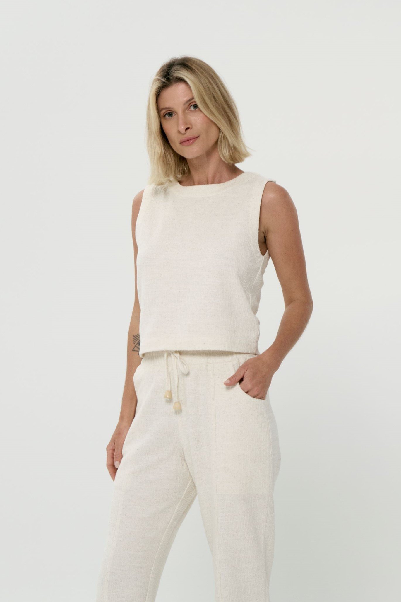 A Regata Tweed Linen tem modelagem de alfaiataria na malha o que traz conforto e sofisticação para usar no trabalho, eventos casuais entre várias outras ocasiões. Feita com fibras naturais do linho, ela carrega o selo Linen, garantindo um tecido nobre, resistente e super durável — ideal para encarar a rotina com leveza e elegância.