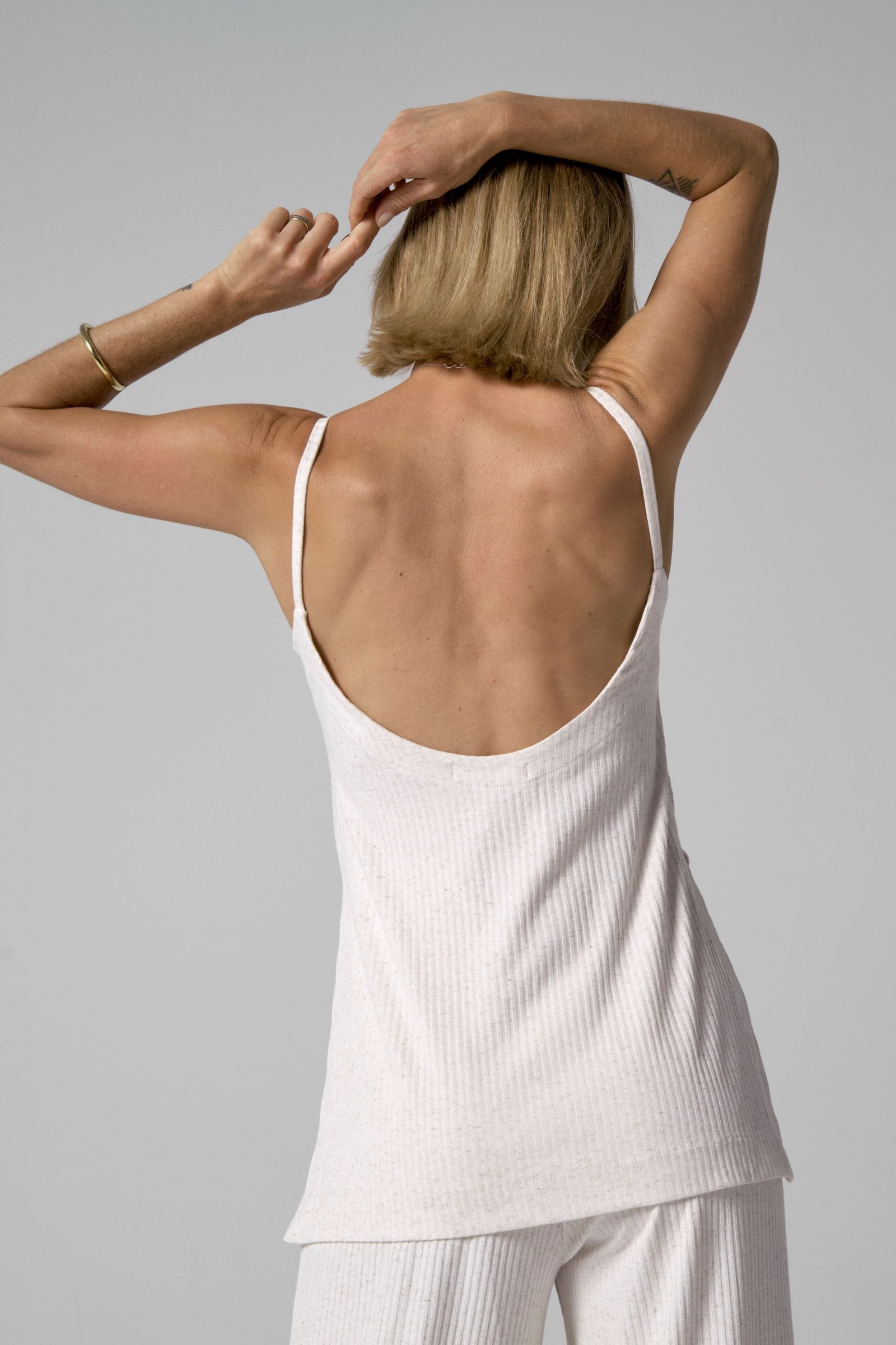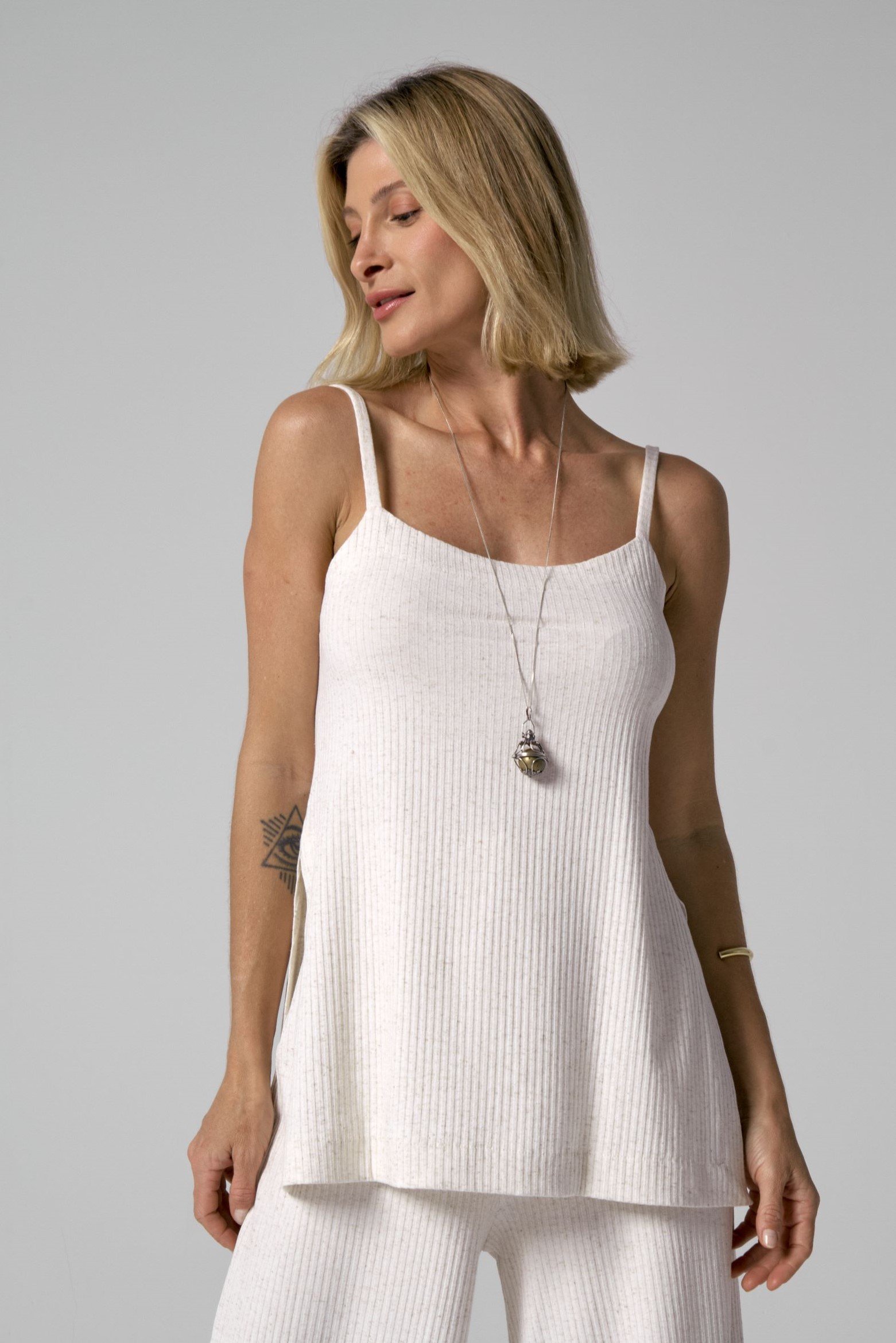 Confeccionada em tecido canelado, possui textura sutil e toque macio, trazendo sofisticação discreta à peça. Seus detalhes incluem alças finas que garantem leveza e feminilidade, e a barra com pequenas aberturas laterais que reforçam a fluidez e modernidade do design.
